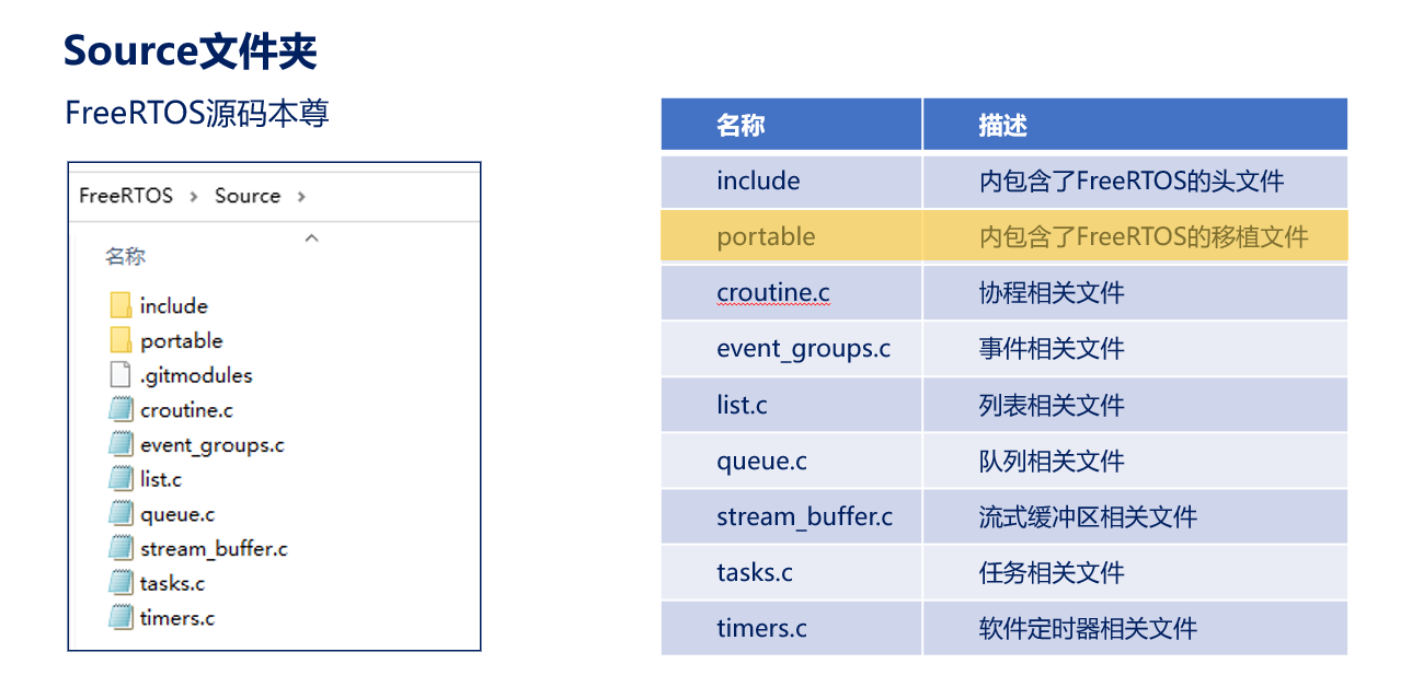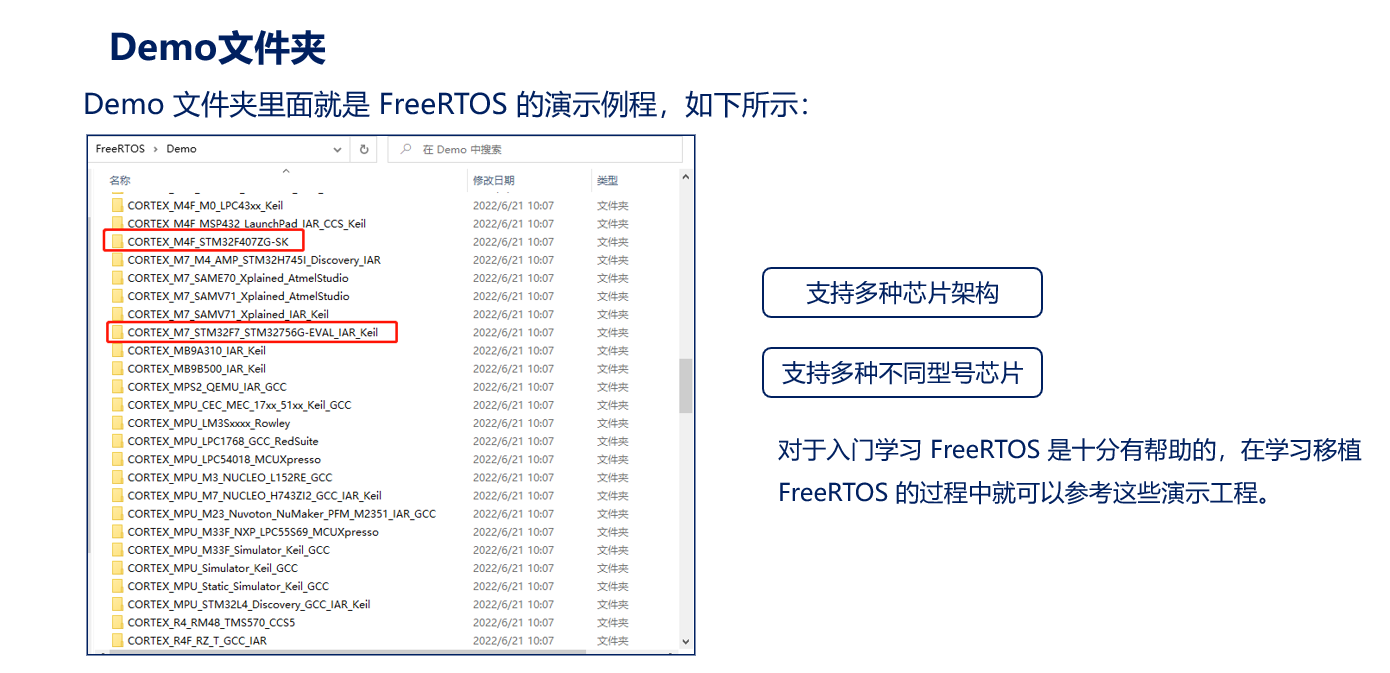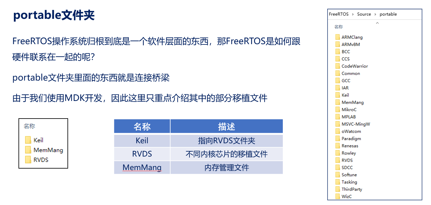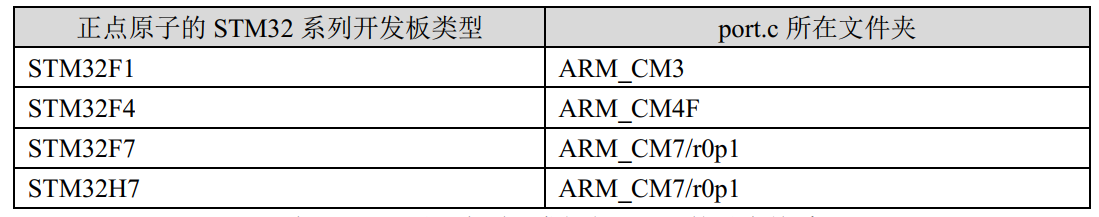 接着是 port.c, port.c 是 FreeRTOS 这个软件与 MCU 这个硬件连接的桥梁,因此对于 STM32 系列不同的开发板,所使用的 port.c 文件是不同的。 port.c 文件的路径在 FreeRTOS/portable/RVDS 下。进入到 FreeRTOS/portable/RVDS,可以看到 FreeRTOS 针对不同 的 MCU 提供了不同的 port.c 文件,具体STM32 系列开发板与不同 port.c 的对应关 系如下表所示: