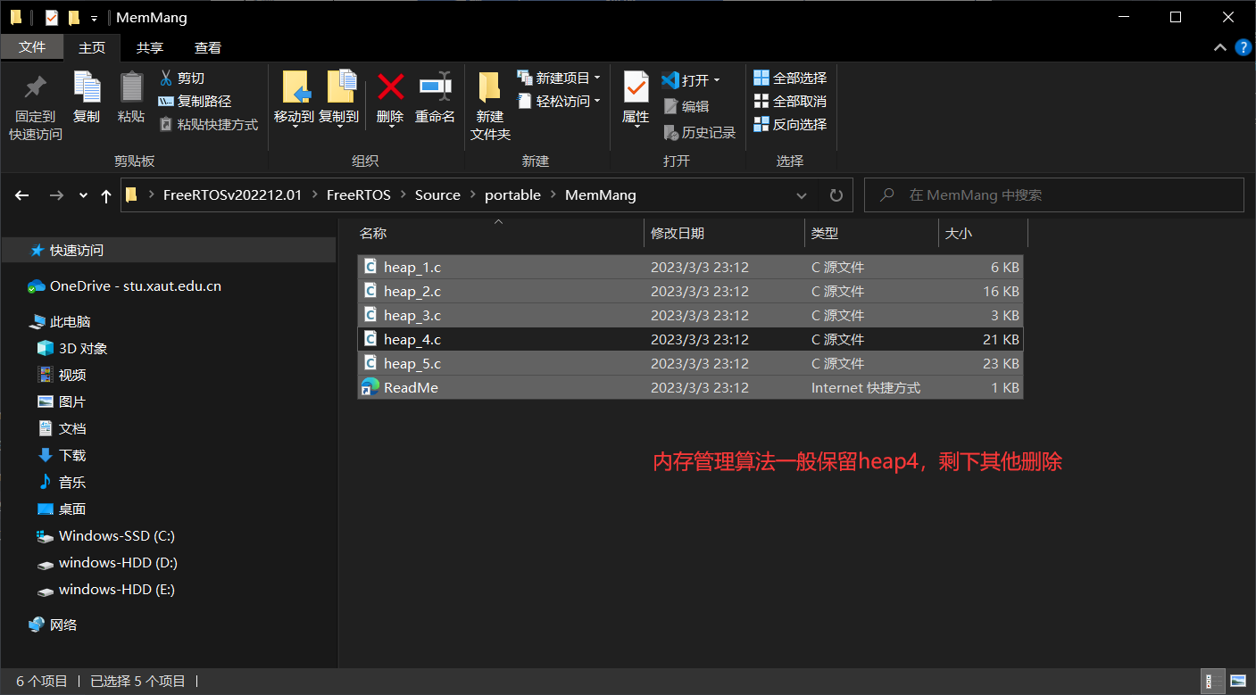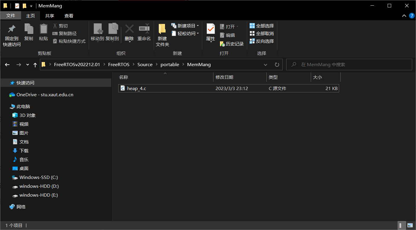 Middlewares/FreeRTOS_PORT 分组用于存放 FreeRTOS 内核的移植文件,需要添加两个文件到这个分组,分别为 heap_x.c 和 port.c。 首先是 heap_x.c, 在路径 FreeRTOS/portable/MemMang 下有五个 C 源文件,这五个 C 源文 件对应了五种 FreeRTOS 提供的内存管理算法,读者在进行 FreeRTOS 移植的时候可以根据需 求选择合适的方法,具体这五种内存管理的算法,在后续 FreeRTOS 内存管理章节会具体分析, 这里就先使用 heap_4.c,将 heap_4.c 添加到 Middlewares/FreeRTOS_PORT 分组中。