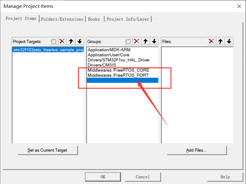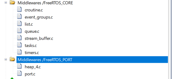 在工程分组里添加新的分组,分 别 为 Middlewares/FreeRTOS_CORE 和 Middlewares/FreeRTOS_PORT,如下图所示: