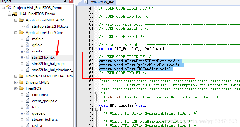打开stm32f1xx_it.c文件,在头部添加FreeRTOS的三个函数导入: