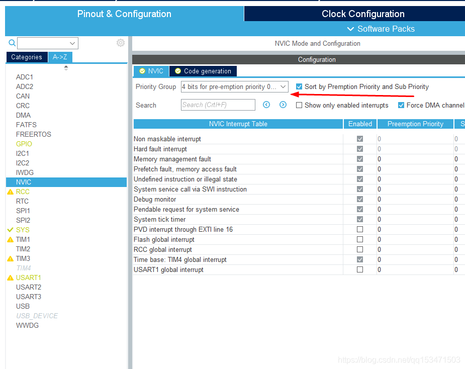 配置中断,注意这里一定要选择组4,也就是全部为抢占优先级: