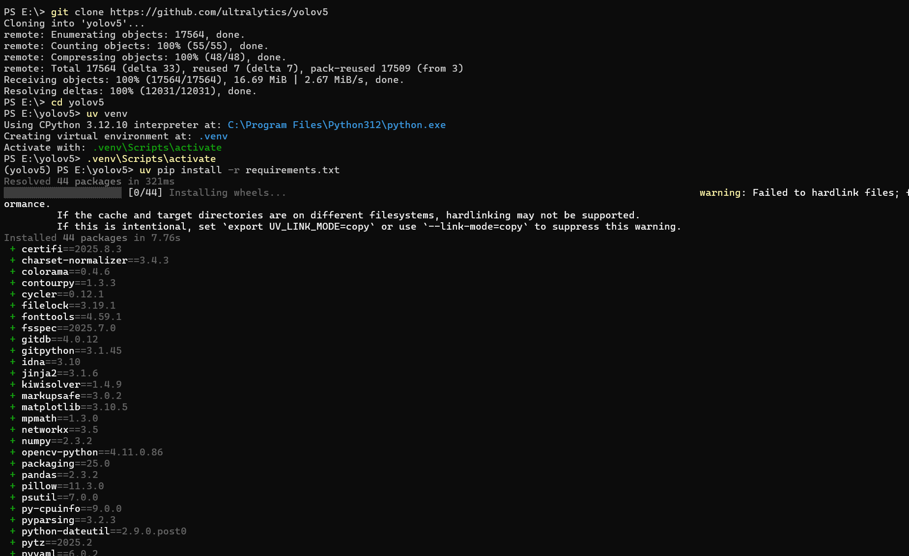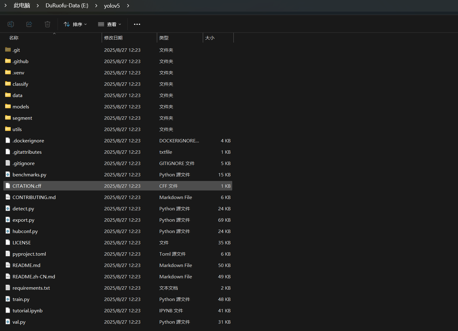 以YOLO V5为例,这里我使用uv来管理Python虚拟环境(请自行提前安装uv和python 注意:Python>=3.8.0 ):