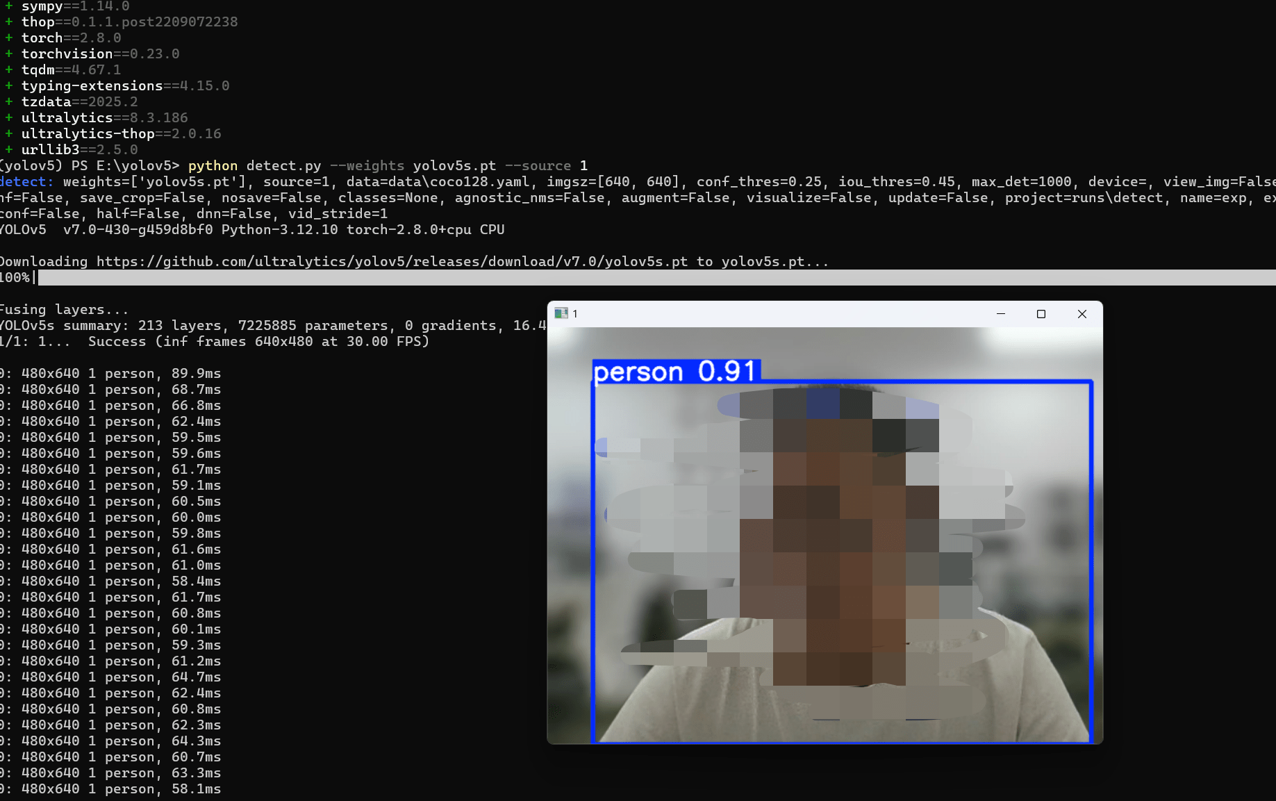 python detect.py --weights yolov5s.pt --source 1运行后效果如下: