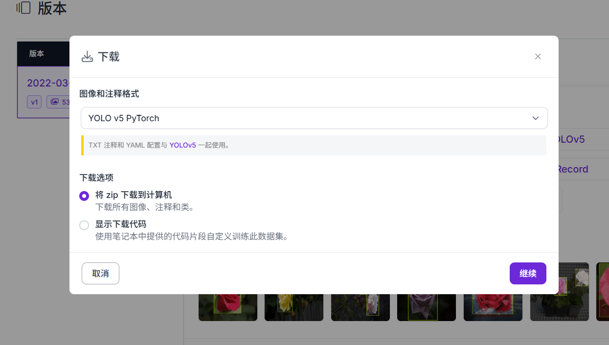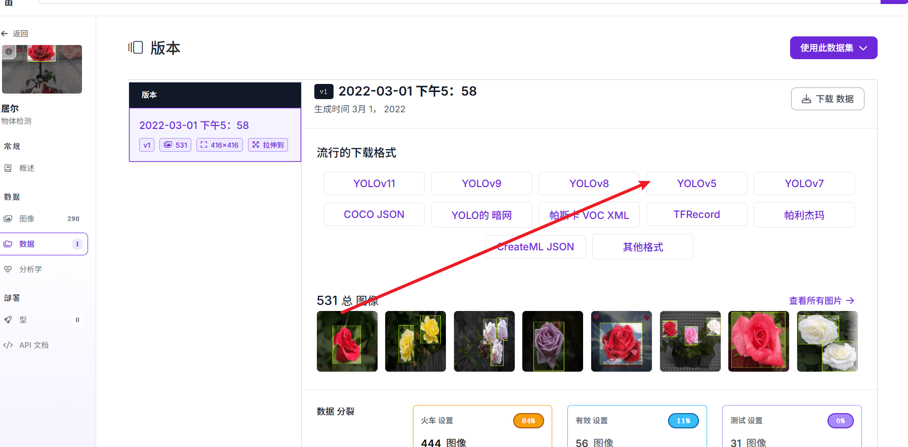 这里我们使用这个: https://universe.roboflow.com/selma-vurgun/gul/dataset/1 这个数据集,一个玫瑰花识别的数据集