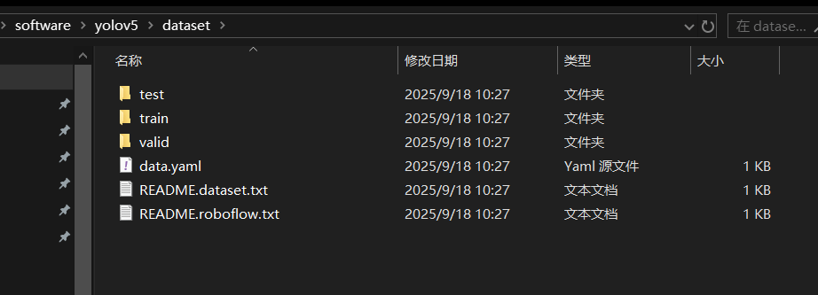 将数据集放到YOLO5文件夹里,命名为dataset (放其他地方也行),如下:
