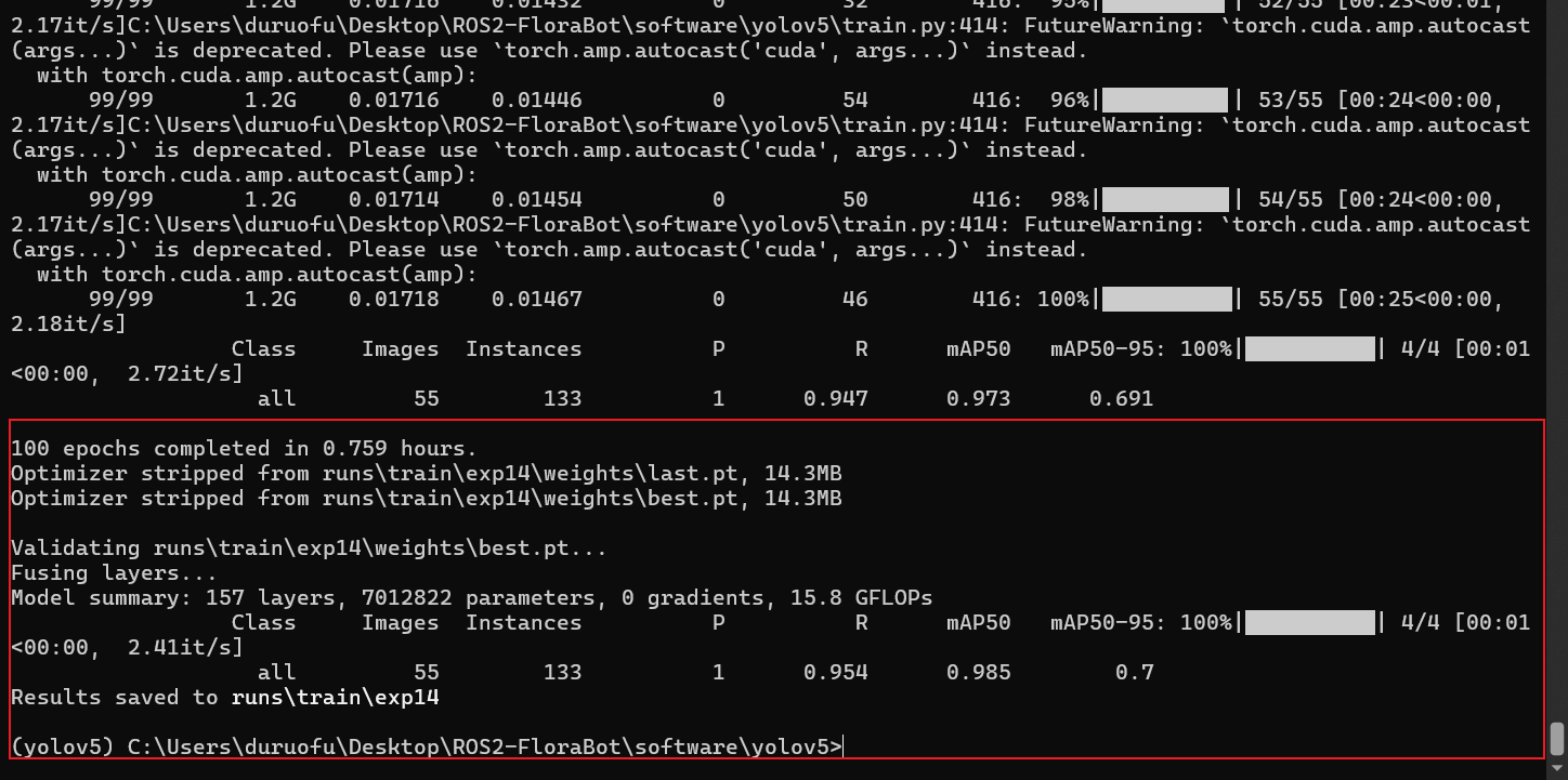 python train.py --img 416 --batch 8 --epochs 100 --data dataset/data.yaml --weights yolov5s.pt --device 0 --cache命令说明: