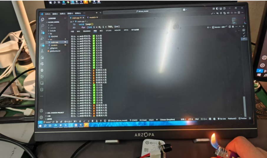 - 输出反量化与判断:将 int8 类型的输出反量化为浮点得分,并乘以 2(这是你自定义的扩展系数,用于调整阈值感知范围)。若得分大于 0.6,即认为检测到火焰,否则判断为无火焰。