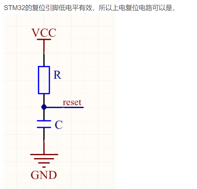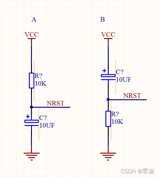 4.2.2 原理图设计 按照我们上面说的理论,其实有两种方式,如下图所示,那么哪种才是我们想要的呢?下图两者的区别在于电容的电阻的位置不同, 由于电容两端的电压不能突变,当刚上电时,A电路为低电平,此时单片机复位,直到保持到1个时间常数后,NRST为高电平,而B电路,一上电为高电平,1个时间常数后NRST管脚为低电平, 并且一直保持低电平, 这样会导致MCU一直复位,所以正确的电路应该A电路,而B电路适合用于高电平复位的MCU。 上图为上电自动复位电路, 如果需要加手动复位的话也和简单,只需要在AB电路的电容两端并联一个按键,当按键按下时,A图中的NRST为低电平,MCU复位,B电路为高电平。