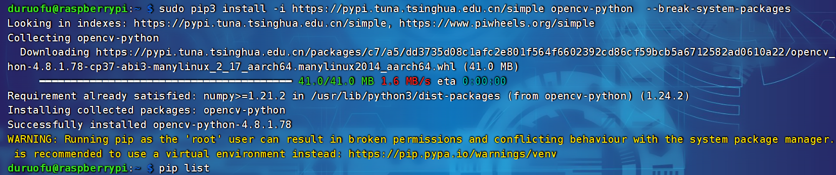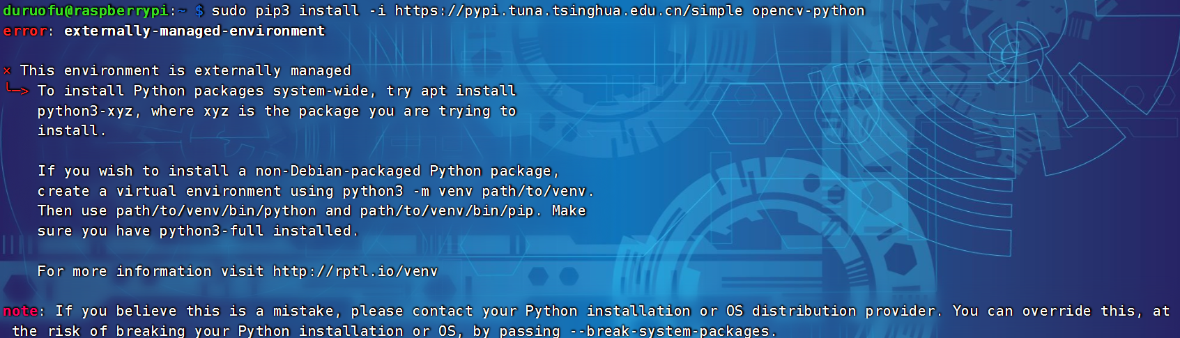 sudo pip3 install -i https://pypi.tuna.tsinghua.edu.cn/simple opencv-python --break-system-packages