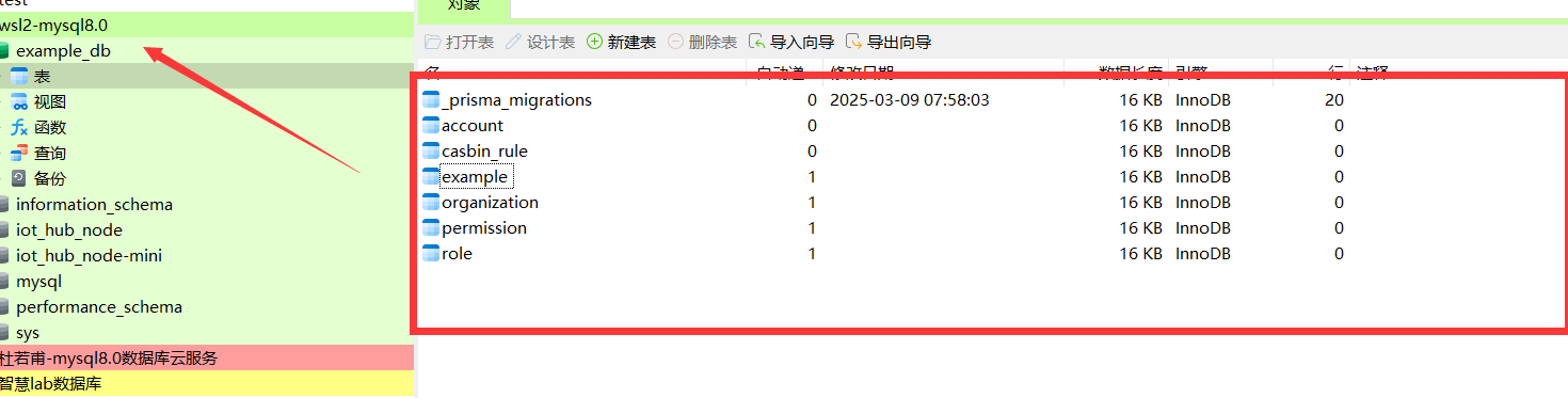 DATABASE_URL=mysql://root:12345678@localhost:3306/example_db使用npm updatedb命令创建数据库表,创建成功后,如下